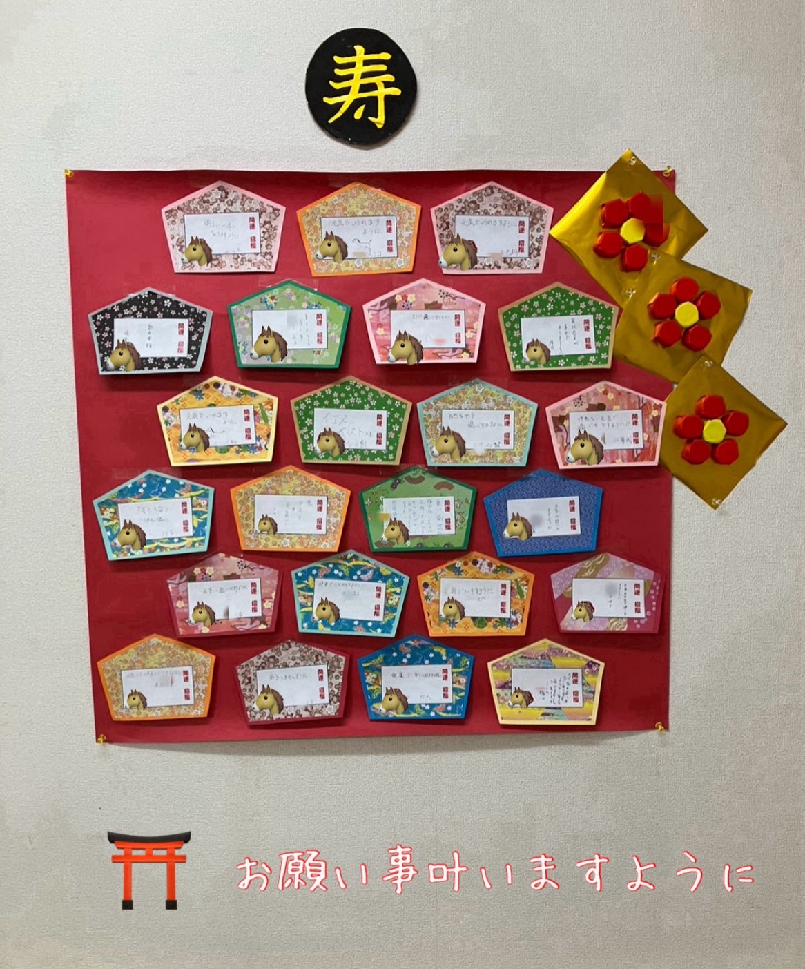 利用者さまにもお手伝い頂いた花で鳥居をイメージしました。