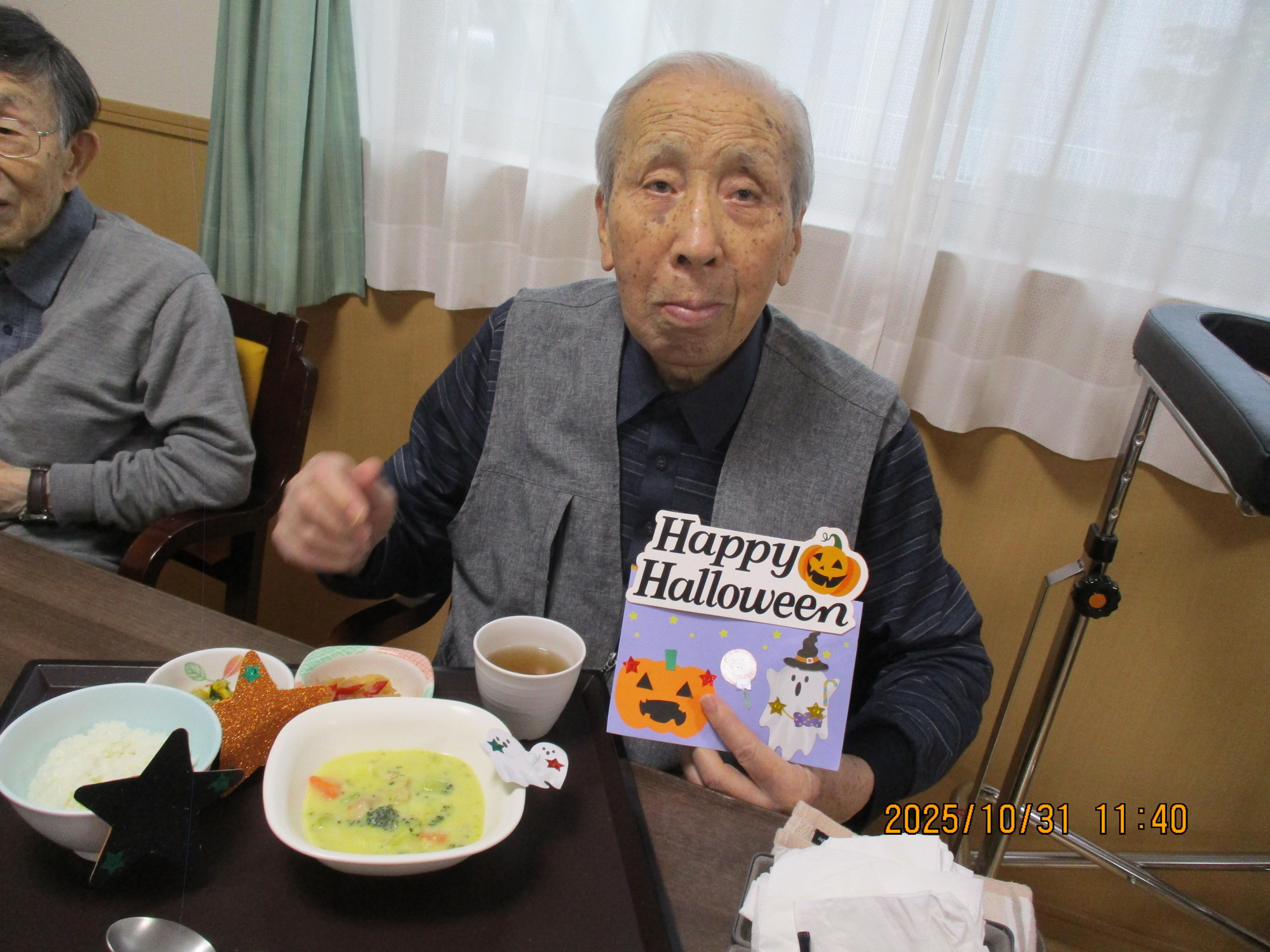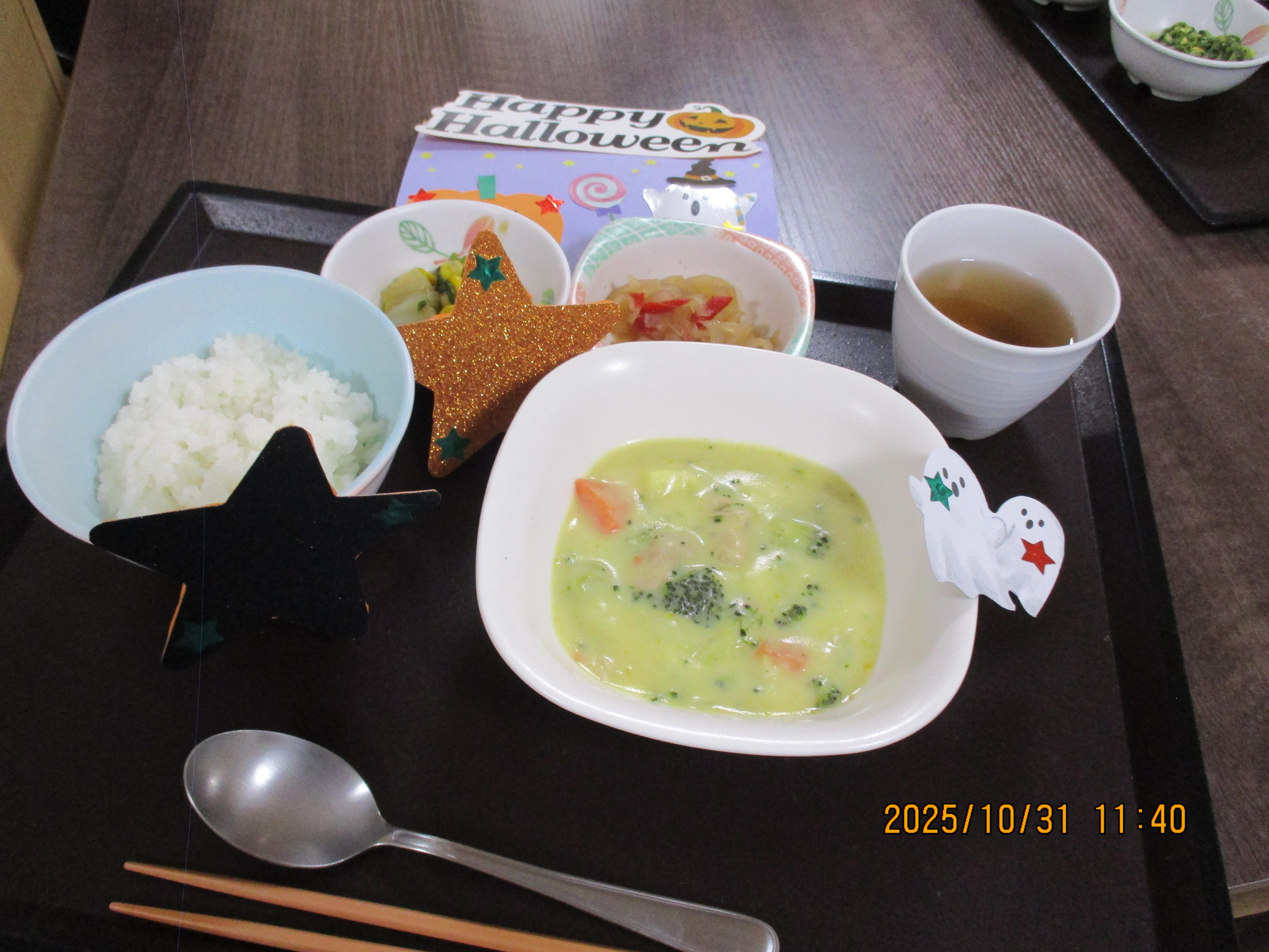 10月の行事食です 2025/10/31 朝夕と気温も下がり過ごしやすい季節となりましたが皆様いかがお過ごしでしょうか? 今月はハロウィンの雰囲気を味わっていただくために、昼食にかぼちゃシチューを提供させて頂きました。 皆様おいしいねと喜んでおられました